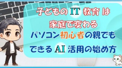 パソコン初心者 子どものIT教育は家庭で変わる|パソコン初心者の親でもできるAI活用の始め方 親がパソコン初心者でも心配なし。小中学生の子を持つ筆者が、家庭でできるAI活用法をやさしく解説。年齢別の使い方、調べ学習のサポート、安全なルール作り、環境づくりなどをご紹介。AIが子どもの学びを広げ、親の負担を減らすポイントがこのページでわかります。 2026.03.17 パソコン初心者
