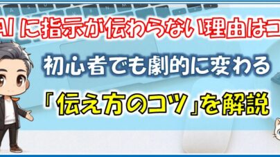 パソコン初心者 AIに指示が伝わらない理由はコレ|初心者でも劇的に変わる「伝え方のコツ」を解説 AIに指示がうまく伝わらない原因をパソコン初心者向けにやさしく解説。プロンプトの基本構造、伝わる書き方のコツ、失敗例と改善方法、今日からできる練習ステップまで。AI初心者でも安心して使い始められる入門ガイドです。 2026.03.26 パソコン初心者