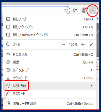 画面右上の3つの点のボタンをクリックしてメニューから「拡張機能」を選び