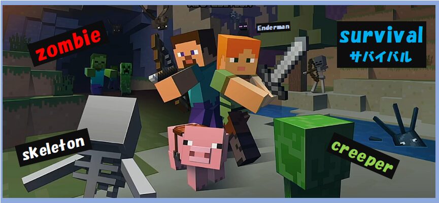 高学年になれば、サバイバルモードに挑戦し、資源を集めたり敵を避けたりといったモードでプレイすることで「計画性」や「問題解決力」を学ぶことができます。