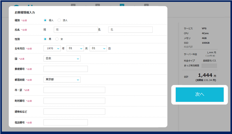 クレジットカードまたはConoHaチャージ(コンビニ払いなど)を選択して必要事項を入力