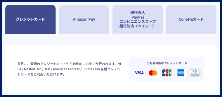 ConoHa for GAMEは、支払い方法が豊富で、クレジットカードを持っていない方でも利用可能です。