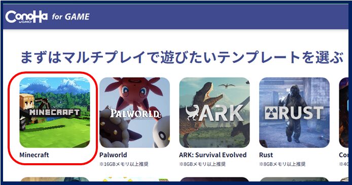 マインクラフト以外でも、さまざまなオンラインゲーム(ARK、RUSTなど)人気のゲーム用のテンプレートが多数用意されています。
